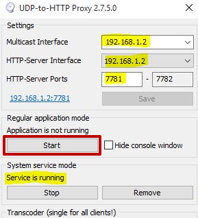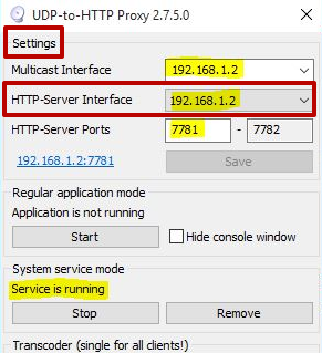 Open the settings for UDP-HTTP Proxy 2.7.5.0. In the “HTTP-Server Interface” dropdown list, find your computer’s IP address (this is usually the last address in the list):
