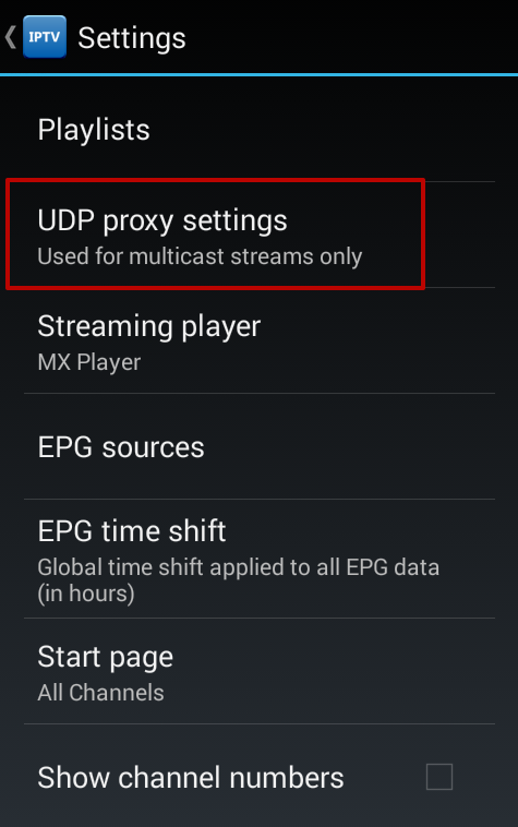 In your IPTV app, open the menu and go to “Settings.” Then select “UDP proxy settings”: