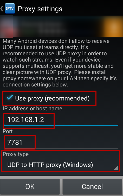 Enter the IP address of the computer where the UDP to HTTP proxy is running, and specify the port number. Select “UDP-HTTP Proxy (Windows)” as the proxy type, then click “OK” to save the settings: