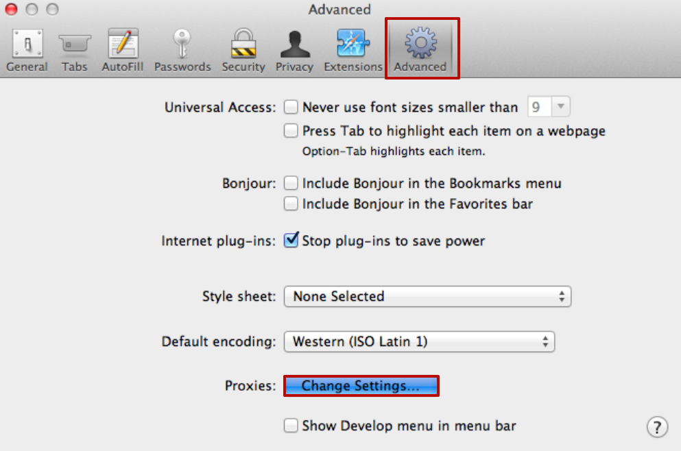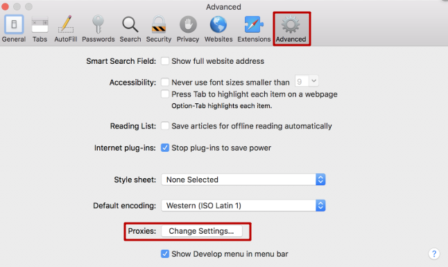 ● In the top area of the browser, select “Advanced” and then click on “Proxies: Change Settings”: