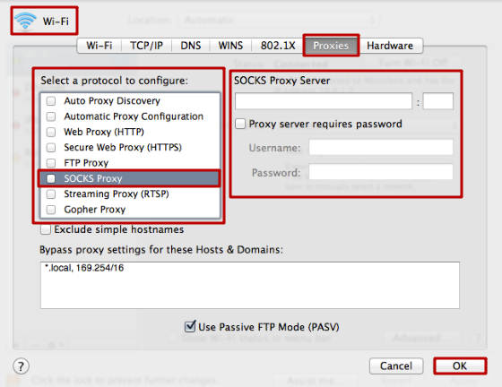 ● In the opened “Wi-Fi” window, select from the menu above the “Proxies” category and uncheck all the boxes. Then click “OK”: