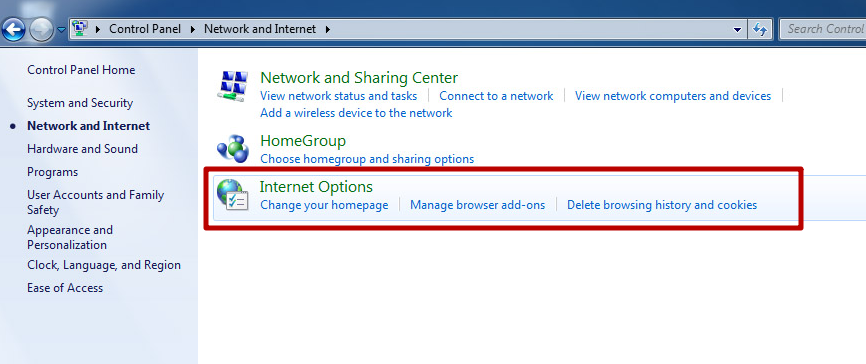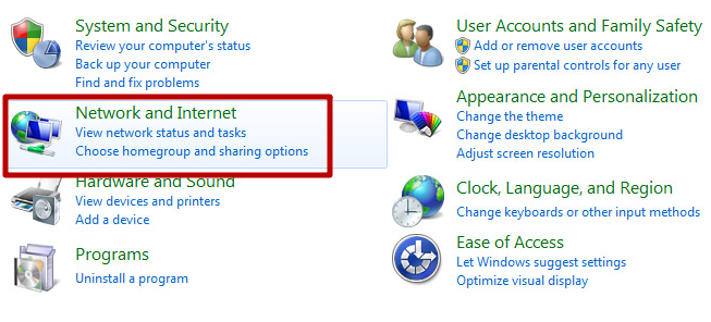 1. Open the control panel and select “Network and Internet”: