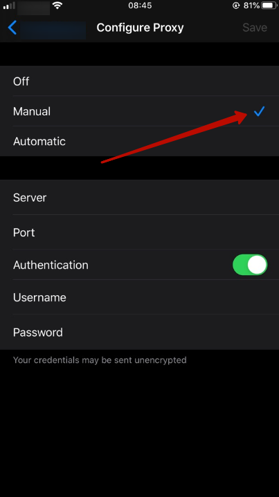 ● Proxy sunucusunu iOS'ta ayarlamak manueldir. Bu işlevi seçin. Windows, bireysel sunucu IP adresinin ve bağlantı noktasının girilmek için kullanıldığı açılacaktır.